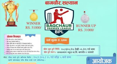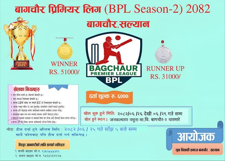असोज १९,सल्यान।सल्यानको बागचौर नगरपालिका २ थारमारेमा बागचौर प्रिमियर लिग बिपिएल सिजन-२ क्रिकेट प्रतियोगिता २०८२ हुने भएको छ । युवा विद्यार्थी समाज बागचौर सल्यानको आयोजनामा सल्यानको थारमारेमा रहेको जनकल्यान नमूना माविको खेल मैदानमा उक्त क्रिकेट प्रतियोगिता हुने भएको हो । गत वर्ष बागचौर नगरपालिका भित्र क्रिकेट ...